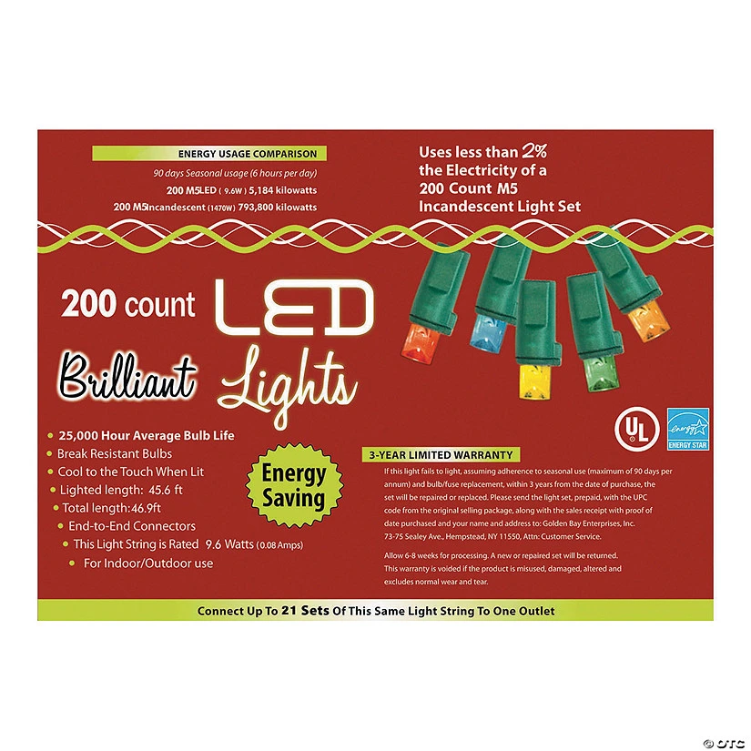 String light set perfect for Christmas or party decoration! LED lighting. 200 count M5 lights with green cord. String has a 45.6 ft lighted length/47 ft total length. Rated: 12 watts (0.10amps)/set 3.0A/120V Fuse Spare:1 fuse. Indoor/outdoor use. Connect up to 17 sets of the same light string to one outlet.
