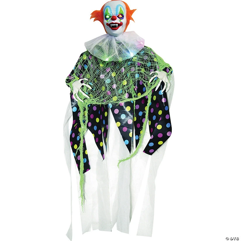 35″ Add some colorful festivity to your haunted scene with this scary Light-Up Clown! Bright green gauze covers a polka- dot robe with white gauzy hangings. Multicolored lights show at the ruffled white collar and in the eyes. His long fangs show in his wide clown smile! Requires 3 LR44 Batteries, included. Measures approximately 5.1″x 7.5″x 5.9in. Made of PVC(10%),plastic(10%),fabric(70%),iron wire(10%).Special Shipping Information: This item ships separately from other items in your order. This item cannot ship to a P.O. Box. This item may be subject to additional processing days.ITEM IS NOT ELIGIBLE FOR EXPEDITED SHIPPING