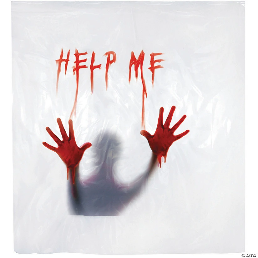 Real shower curtain with image of a person with out reaching blood stained hands and the words HELP ME in dripping blood written above. 72 inches x 72 inches