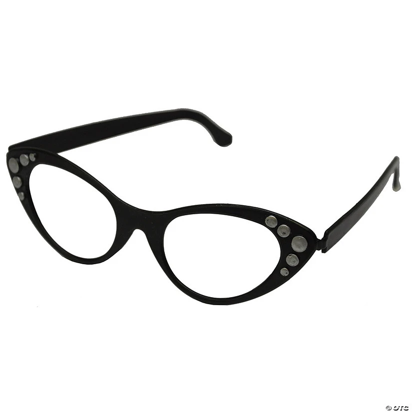 Black plastic cat’s eye frames with acrylic rhinestones. No lenses.