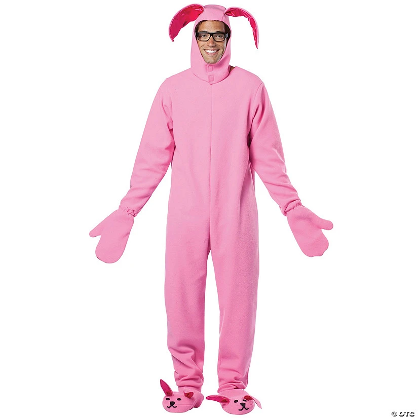 Christmas Story Bunny. Adult Costume. Remember that classic movie A Christmas Story? Now, you can have pink pajamas just like Ralphie Parker! Costume includes: One piece pink bunny suit, matching hood with floppy ears, mittens, and shoe covers. Available Sizes: One size fits most adults. This is an officially licensed A Christmas Story costume.