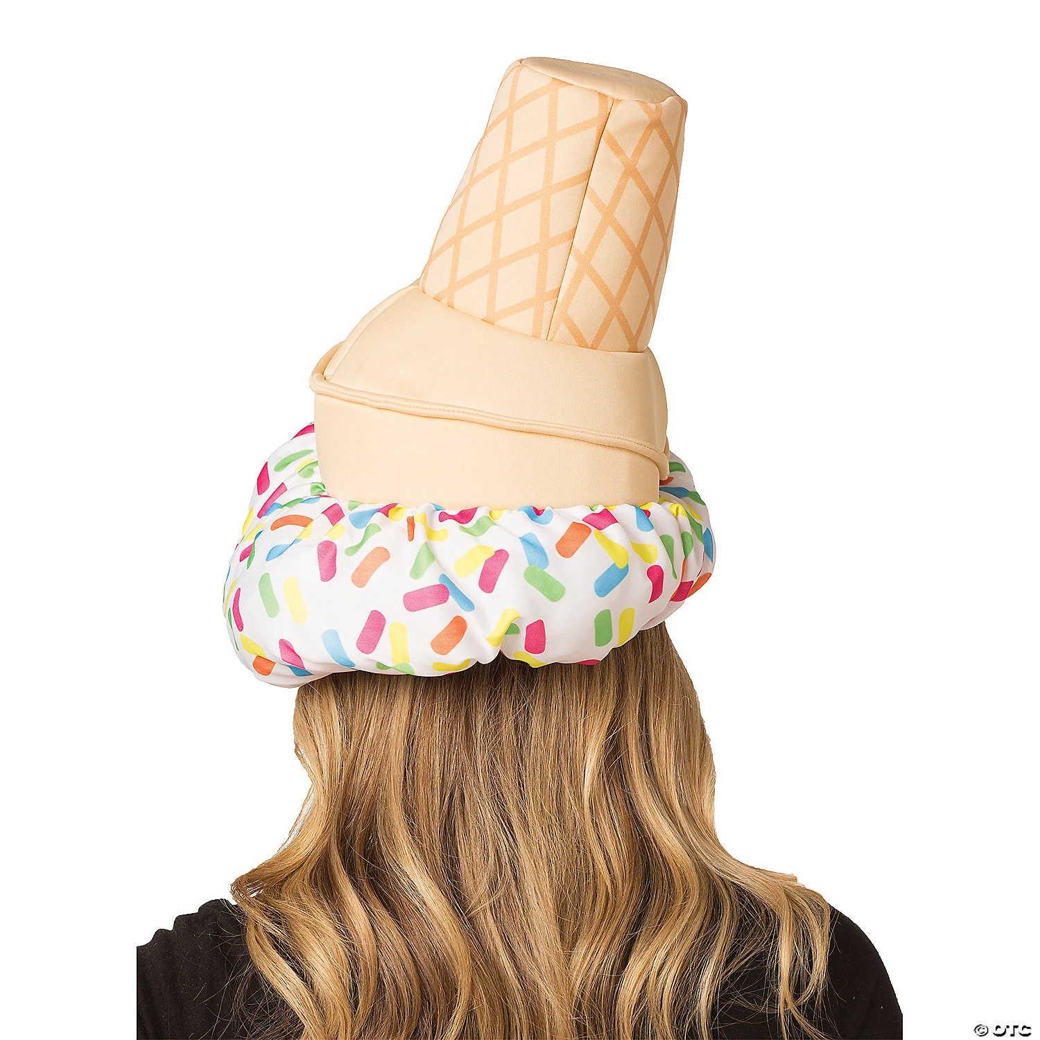 Ice Cream Cone Hat. Show your friends your favorite food with this fun hat and wear it on your head and not your waistline! Includes: Upside down vanilla custard cone with sprinkles. Stuffed and lined for support. 100% polyester. Available Sizes: One size fits most adults. Black shirt is not included.