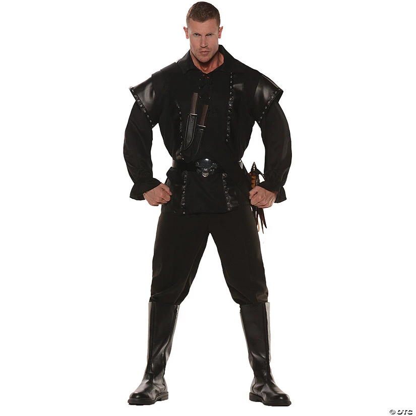 Sail the seas searching for buried treasure with your fellow shipmates, buccaneers, and the pirate Captain!Here is a pirate costume for a true Scoundrel! Costume includes a faux-leather trimmed tie-front shirt, pants, and sword belt with two plastic knives that fit into their own loops. Comes with a vinyl belt with a plastic skull buckle. Polyester.Available size:XXL 48-50Boots and sword are not included.Special Shipping Information: This item ships separately from other items in your order. This item cannot ship to a P.O. Box. This item may be subject to additional processing days.