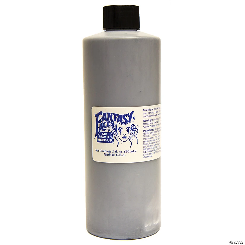 Gray, 16 oz. Air Brush Makeup Includes: Water-based makeup that will not clog your airbrush. Dries instantly. Will NOT rub off on clothes or skin. Will NOT fade and is water- resistant, but removes instantly with soap! Ingredients are F.D.A. approved. In fact, it’s so safe you can even spray it in your hair, as well as on material, easter eggs, and even balloons. Sprays 250-350 stencils per oz.