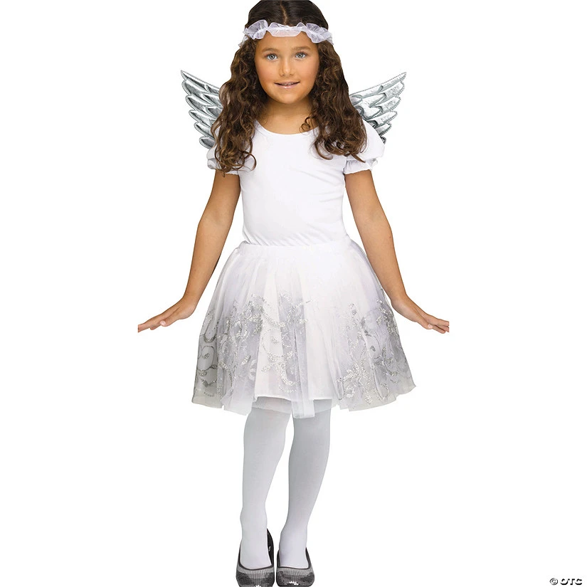 The perfect out fit for you own little angel! Angel Set with Wings includes an elastic-waisted White Tutu Skirt made of a soft sheer mesh top layer with an underlayer of silky polyester. The Sheer Layer has lovely glitter scrollwork designs all around the hemline, and the shirt measures approximately 12 inches long. Comes with a beautiful metallic set of wings with stitching to resemble feathers and a 17 inch wingspan. Elastic shoulder loops with a Velcro closure keep the wings in place. Top it off with a ruffled sheer white mesh headband on elastic with a velcro closure. Just add your own white leotard or top and shorts for a great angelic look! 100% Polyester. One size fits most children.