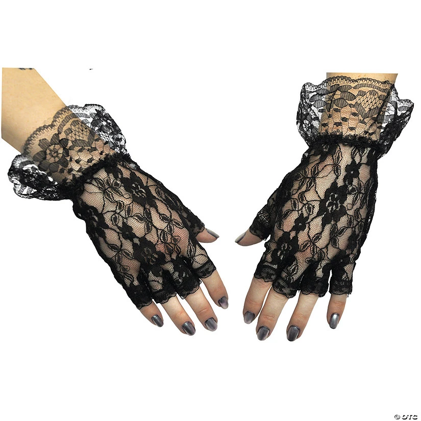 Lace Fingerless Gloves. Complete your costume with these gloves Includes: Black nylon lace fingerless wrist length gloves. Available Sizes: One size fits most women.