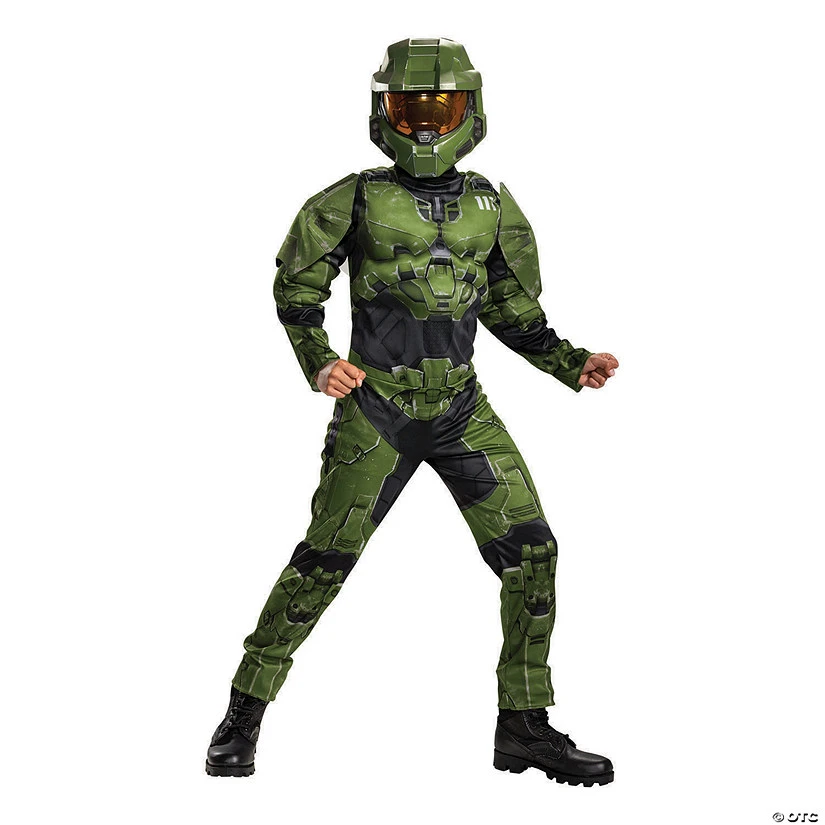 Now you can dress up as your favorite video game character from Halo Infinite with this Master Chief Infinite Muscle suit. Save humanity when you become the greatest Spartan soldier of all time. The Halo Master Chief Infinite Muscle Child costume by Disguise features a green and black jumpsuit with muscle torso and arms. Also includes character half mask. Boots not included. © 2020 Microsoft Corporation. All Rights Reserved. Microsoft, Halo, the Halo logo, Xbox, the Xbox logo and 343 Industries are trademarks of the Microsoft group of companies.Includes:• Jumpsuit• Mask