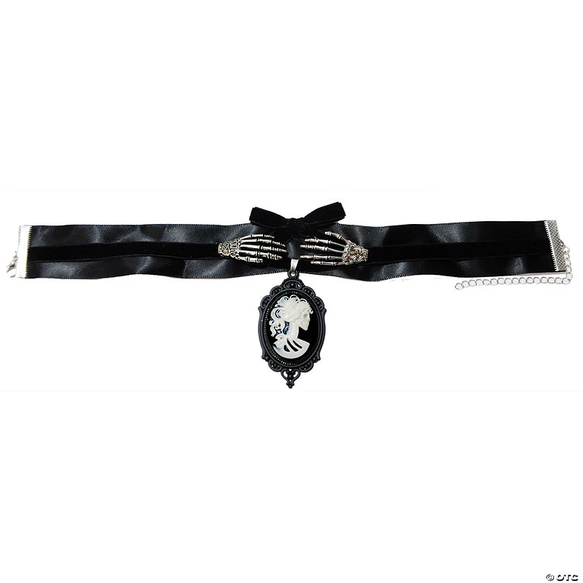 A great accessory for your ghost or spirit costume! Satin choker with velvet strip and bow tie, metal ends and skeleton hands with skeletal cameo attached. Adjustable chain and clip closure. 4″ tall X 12″ wide. Actual choker height 1-1/8th” tall. Available Sizes: One size fits most adults.