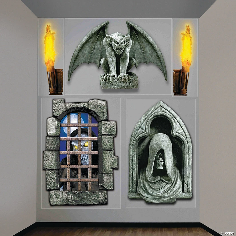 This ultimate pack of wall Halloween decorations has all you need transform your home into the haunt you’ve always wanted! Can be used as indoor or outdoor Halloween decorations. This pack of creepy wall decorations features a realistic-looking stone gargoyle, flaming sconces that look so real you can almost feel the heat, a shrouded skull in a recessed area giving the illusion of depth and a skeleton peering through a barred window from outside. 4 ft x 5 ft. Plastic static cling film. Secure with double-sided tape as needed. Printed on a transparent background with opaque inks for a great 3D illusion.