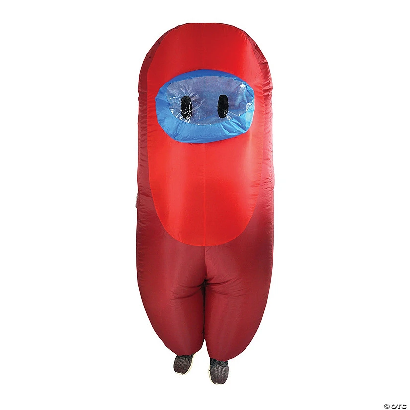 The SUS Crewmate Killer Costume comes in vibrant colors and is very lightweight and odor-free. Comfortable and easy to wear with good range of motion. The blower fan that inflates the costume is always working to keep you cool. There is elastic at the ankles and the arm sockets to seal in the air for proper inflation. The blower/fan inside the costume requires 4 AA batteries (not included).Child size fits heights from 4’5 to 5’0.