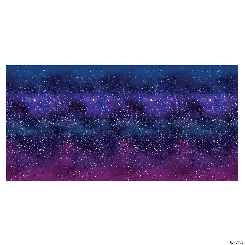 This great galaxy backdrop will be great for any event or party with a science fiction or space theme. Great for photo ops. This plastic backdrop features a purple and black galaxy design. Can be attached to the wall with tape.Measures 4 ft. x 30 ft.