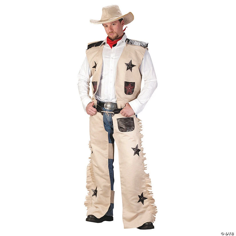 You will be ready to saddle your horse and trot into the Wild West in your polyester Rodeo Cowboy Costume for Men. This western Halloween costume will be just what you need to satisfy your taste for a Cowboy style. Included is a tan vest and chaps embroidered with brown pocket patches and star embellishments and a red neckerchief. The ultimate Cowboy outfit needs its signature piece, the cowboy hat, which also comes with our Rodeo Cowboy Costume for Men. Dress up in this western outfit over your own a pair of jeans and a button up shirt. The one size fits most adult sizes in 33-45. Includes:• Cowboy hat• Vest• Chaps • Red neckerchief. Imported.