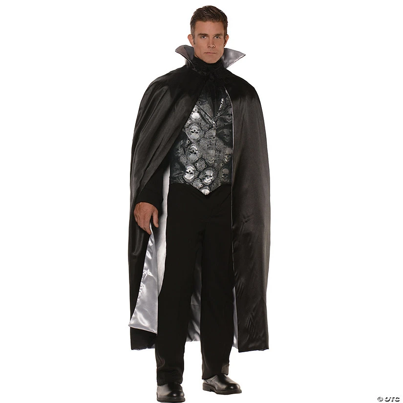 A perfect costume for giving your friends a sinister shock! Skull printed jacquard skull print vest, pants, jabot, and full Length satin double sided cape.