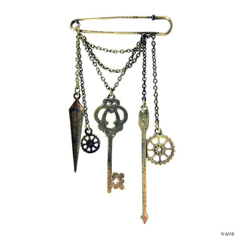 Oversized Pin Drape with IconsGreat addition to your Steampunk costume! Includes: Antique style metal safety pin with five metal icons hanging from metal chains. 2-1/4″ wide X 4-3/4″ lon.