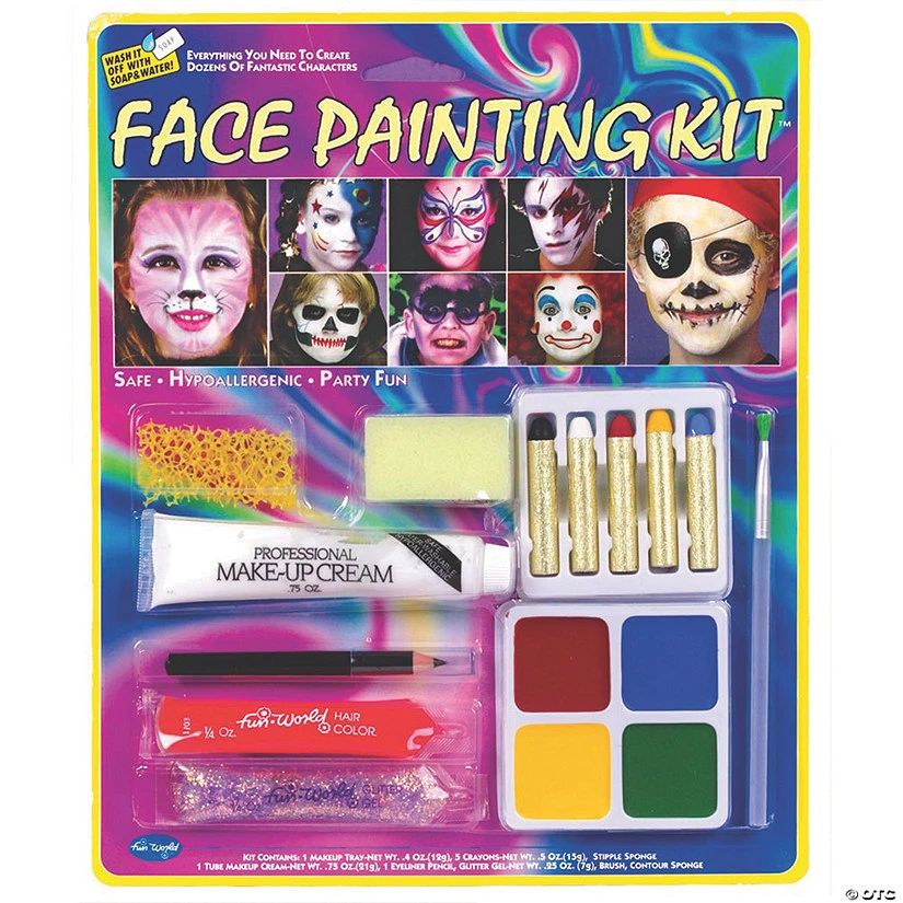 Create dozens of fantastic characters! This makeup kit is perfect for Halloween costumes, face painting at parties and community celebrations, theater productions and more. You have everything you need here to transform you and your friends into whomever you want to be.Includes:• 4 color makeup pallet• 5 makeup crayons• 3/4 oz. tube of white foundation makeup• Black makeup pencil, • 1/4 oz. glitter gel• 1/4 oz. fake blood• 2 makeup sponges • Makeup brush This item cannot ship to a P.O. Box. This item may be subject to additional processing days.