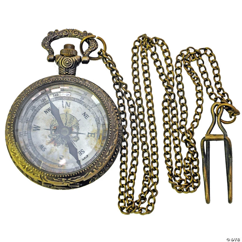 Never get lost again! Includes: Compass features an open faced pocket watch style compass on a long chain. Inside, the compass has a white dial and black pointer. The compass may be weathered and distressed, but the intricate designs show this once was very prized ornament for a pirate.