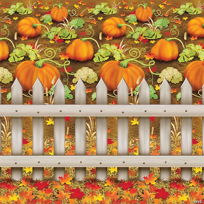 Insta- Theme . Perfect background for celebrating fall festivals, Halloween and Thanksgiving! ncludes: Pumpkin patch with picket fence backdrop. Measures 4 ft. x 30 ft.Made of plastic. Can be attached to the wall with tape. (C) 2018 The Beistle Company.