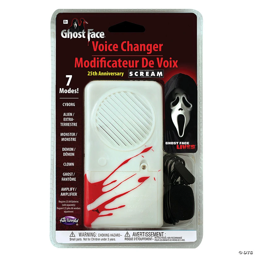 25th Anniversary Scream Voice Changer Chose who you want to be but trust us, it will be scary! Have some fun with this Deluxe voice changer. Change your mode and speak like your desired ghoul . Keep your friends guessing when you hide and speak to them as if they should know who this strange voice may be. 6 Modes Included: MonsterAlienCyborgDemonGhostClownAmplify Your Own Voice!Special Shipping Information: This item ships separately from other items in your order. This item cannot ship to a P.O. Box. This item may be subject to additional processing days.