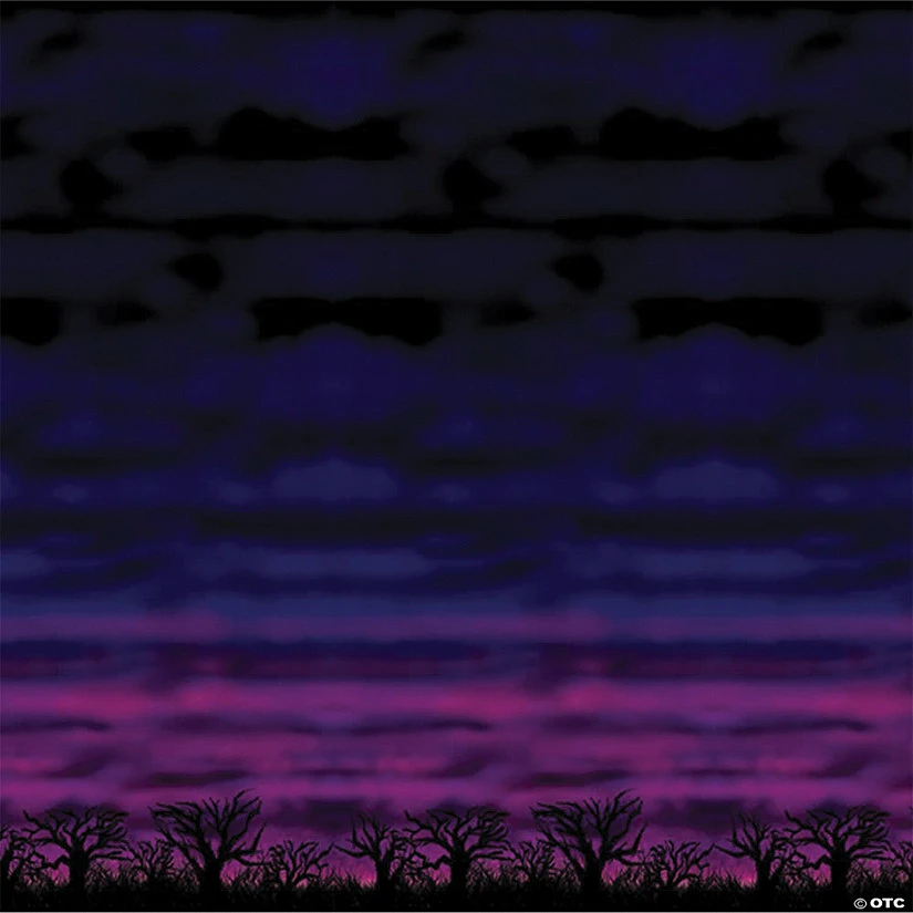 Instantly set the mood at your Halloween party with a this Spooky Sjy Backdrop. Featuring a purple and pink sky and a fog-covered haunted forest with acid green shadowing, this fabulous room or window decoration and makes a great back drop for photo-ops or your next Halloween event. Vinyl. 4ft x 30ft. Imported.