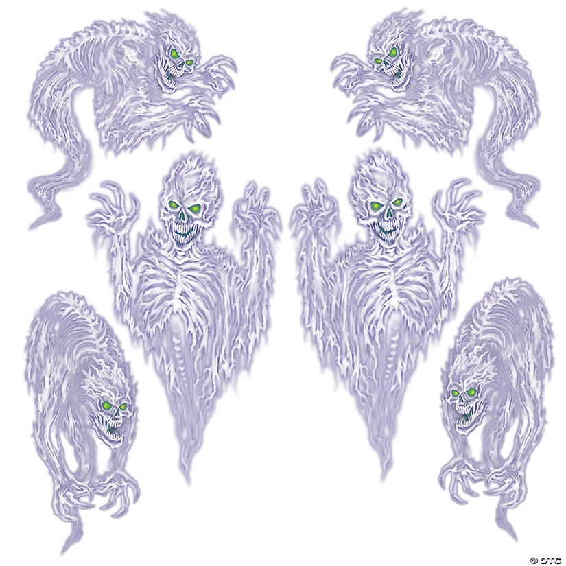 Skeletal reapers will haunt your nightmares.Bone chilling! Includes: 6 ghostly spirits all poised and ready to strike! Polypropylene. Measure between 31″-39″. Need to be cut out. 1 sheet right facing ghosts, 1 sheet left facing ghosts.
