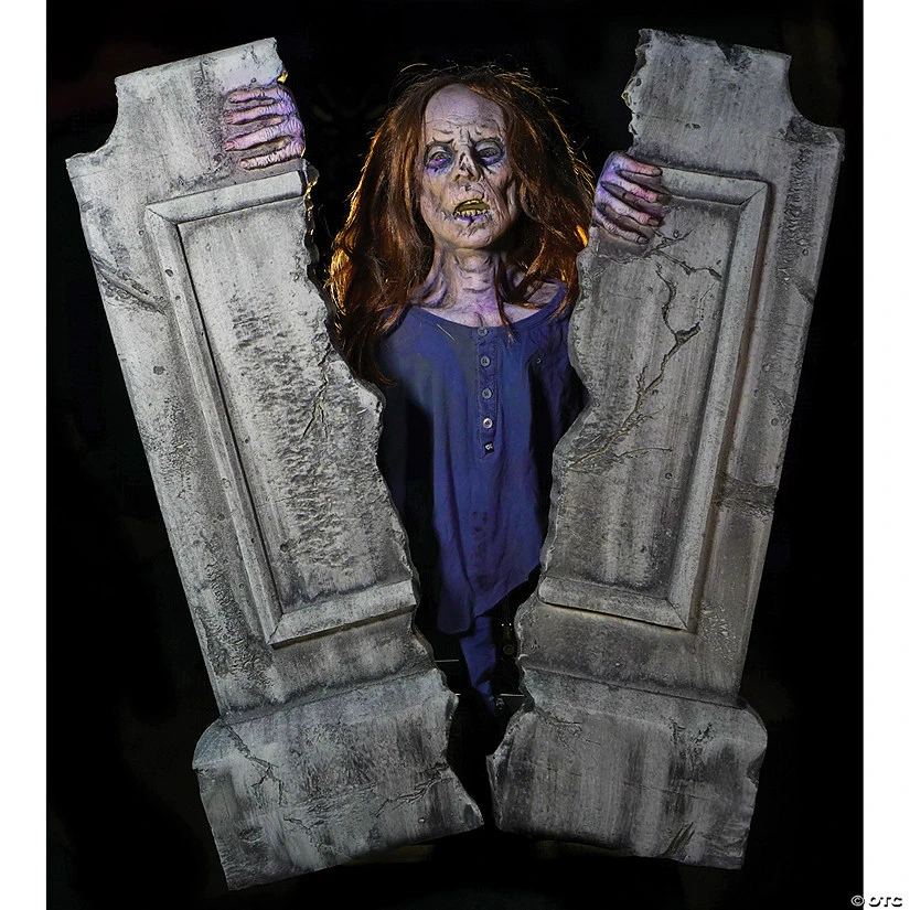 This tombstone and zombie prop is perfect for many uses! This is one of our great static props. This tombstone and zombie prop is perfect for many uses! For your Halloween display, haunt, or yard haunt. Imagine a cemetery or zombie scene with this amazing prop in it! Made of latex and foam with metal armature.